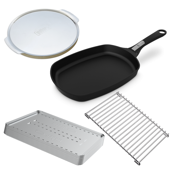 Explore a range of cooking possibilities with this starter pack for your Baby Q barbecue. Whether you’re frying eggs and pancakes for breakfast, baking a brownie for morning tea, cooking up a pizza for lunch or roasting a chicken for dinner, this starter pack has all you need. This pack features a roasting trivet and 10 convection trays, a pizza stone with pizza tray and a frying pan with detachable handle all specially designed and tested for use in your Baby Q barbecue.