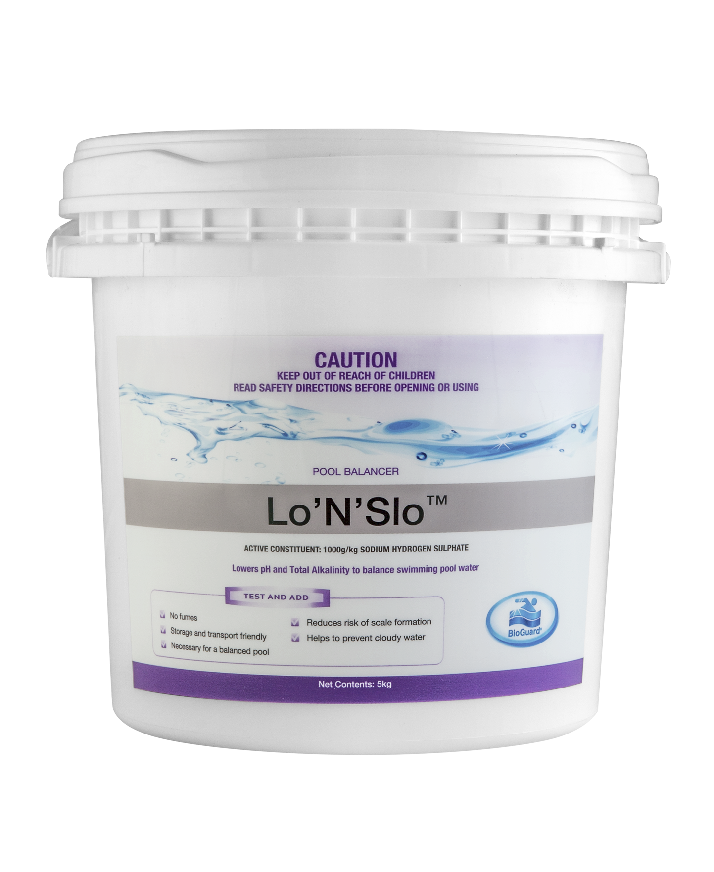 BioGuard LoNSlo is a granular product designed to decrease Total Alkalinity and pH levels in pool water to prevent cloudy water, scale formation, high acid demand and poor chlorine efficiency.