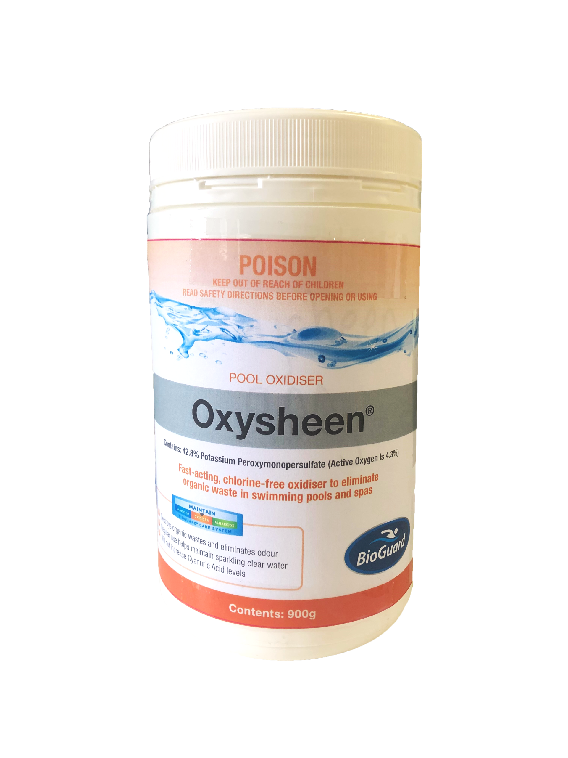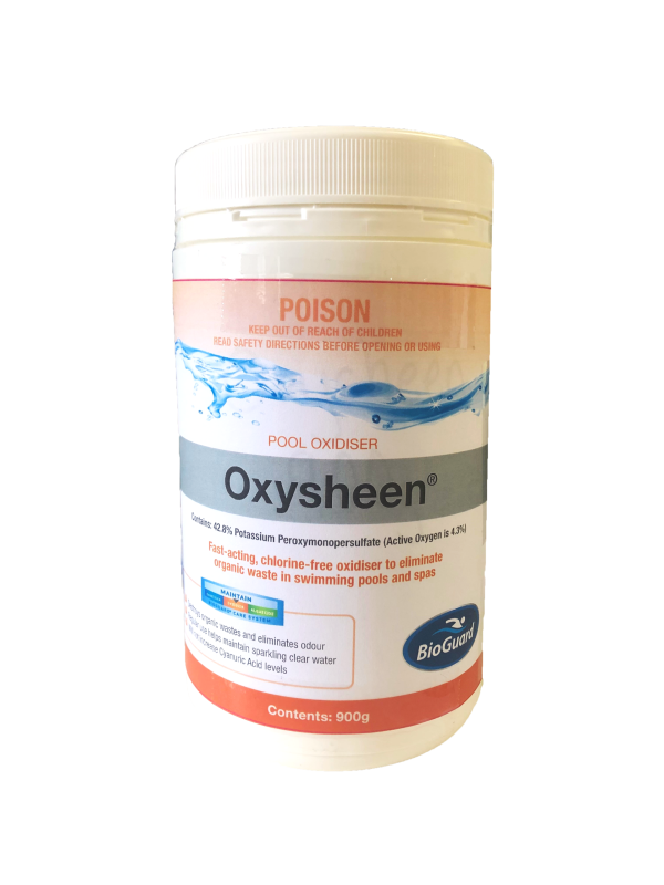 BioGuard Oxysheen is a chlorine-free, stabiliser free oxidiser treatment for swimming pools. It is easy to use, fast dissolving and swimming can resume one hour after treatment. Regular use will help maintain sparkling clear water by destroying irritating chloramines and soluble organic wastes that cause dull cloudy water.