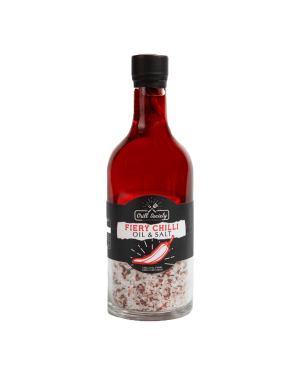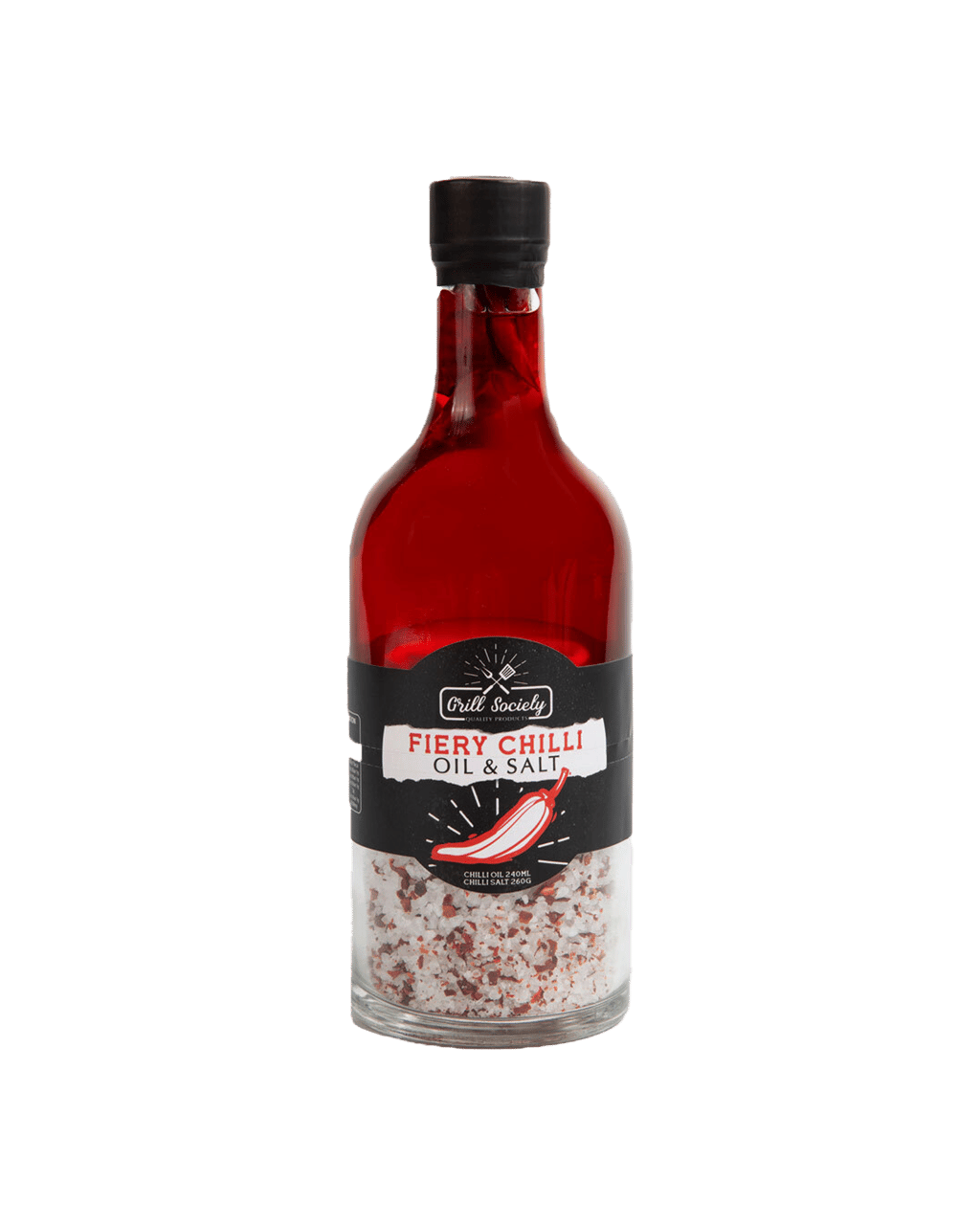 Grill Society Fiery Chilli Oil 240ml & Chilli Salt 240g Combo BottleIngredients (Chilli Oil): Sunflower Oil, Chilli (Whole), Chilli Extract, Colour (160c)Ingredients (Chilli Salt): Salt, Chilli FlakesIncludes:1x 240ml Chilli Oil Bottle1x 240g Chilli Salt Bottle