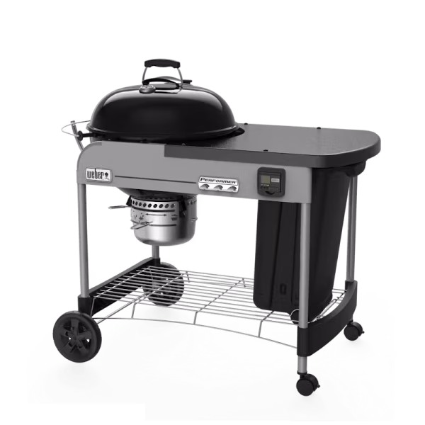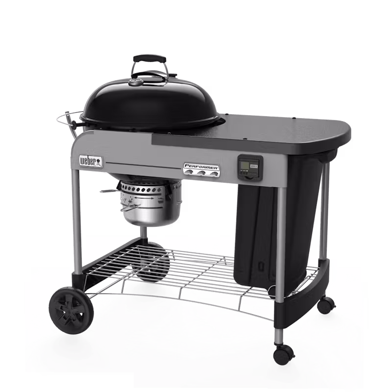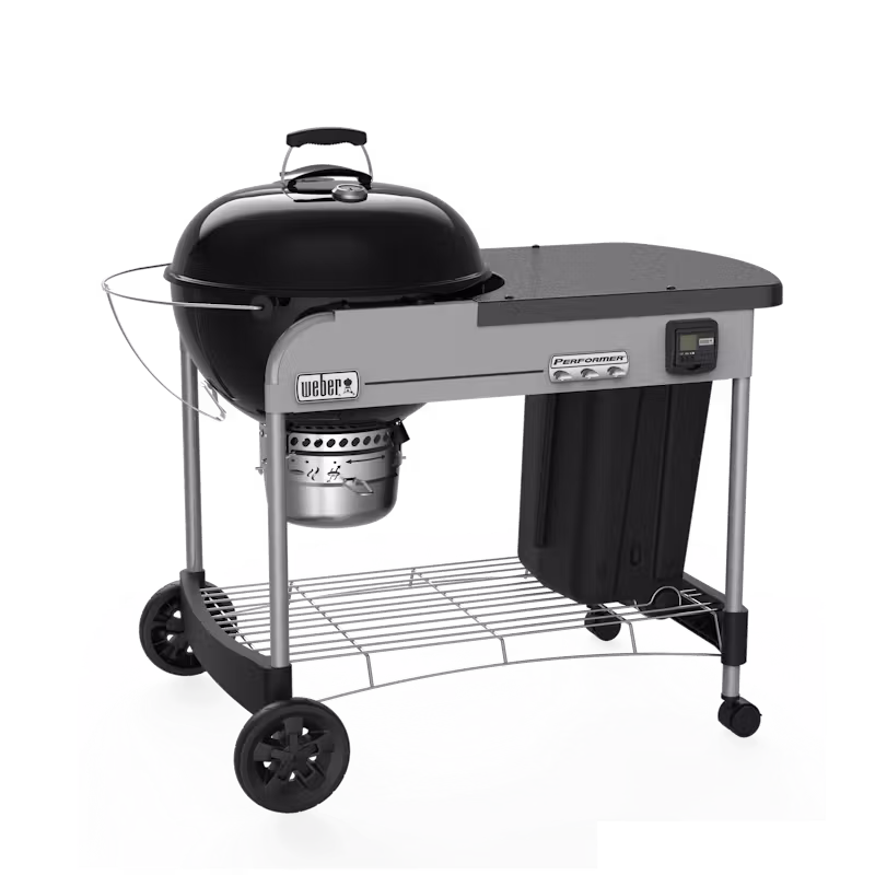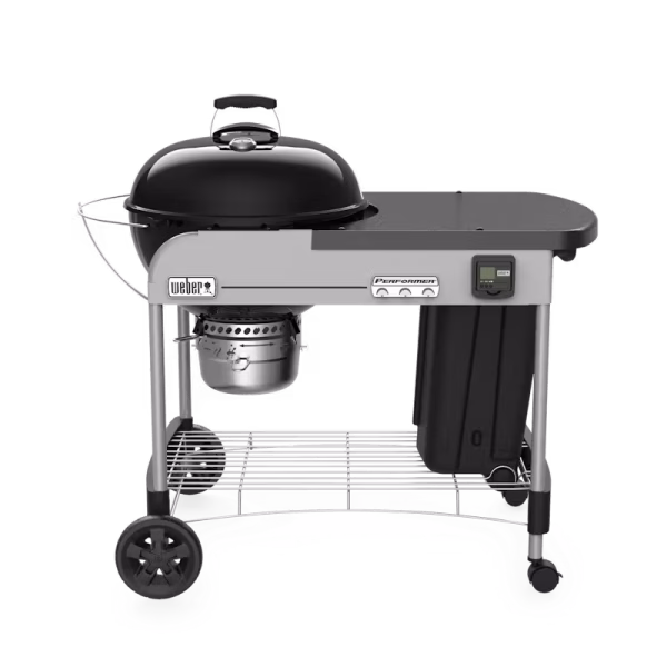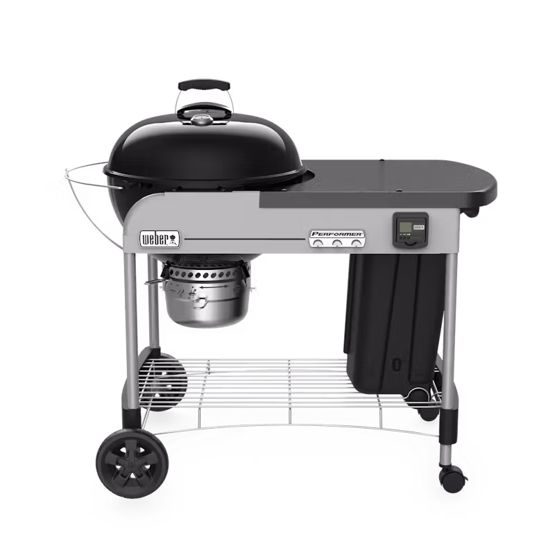 The ultimate Weber kettle is the Performer Premium. The convenient work surface is made of painted metal and underneath is a pull out storage bin for items such as additional charcoal or smoking woods. The Performer Premium also features a Tuck-Away lid holder that allows the lid to slide back and out of the way when accessing your food. And, with the removable digital cooking timer, you can take the guesswork out of timing those magnificent Weber roasts to perfection. The Performer Premium also features a stainless-steel Weber Gourmet Barbecue System cooking grill, P-vents, ash catcher ring with smoke setting indicator, and black lid handle and wheels.